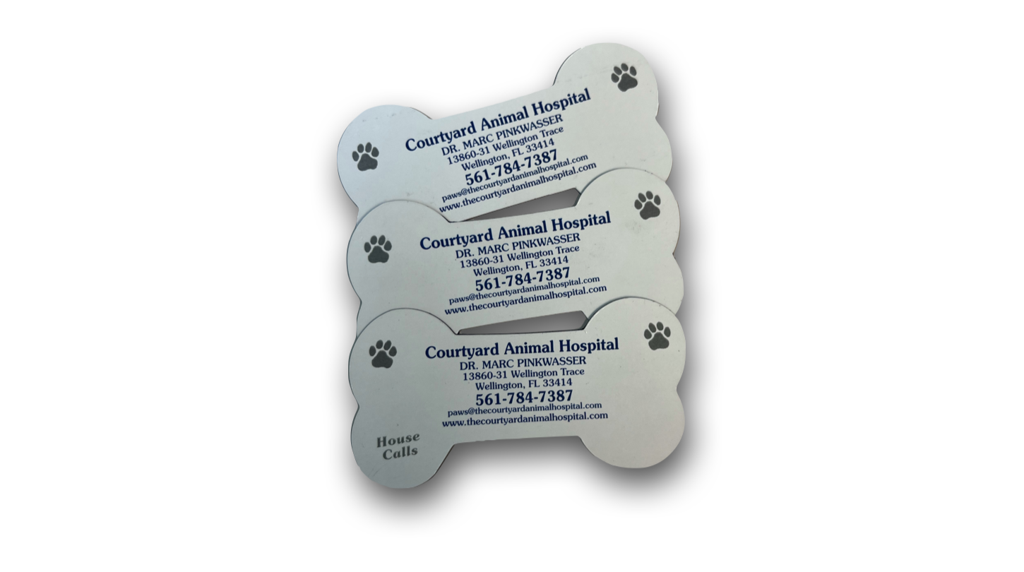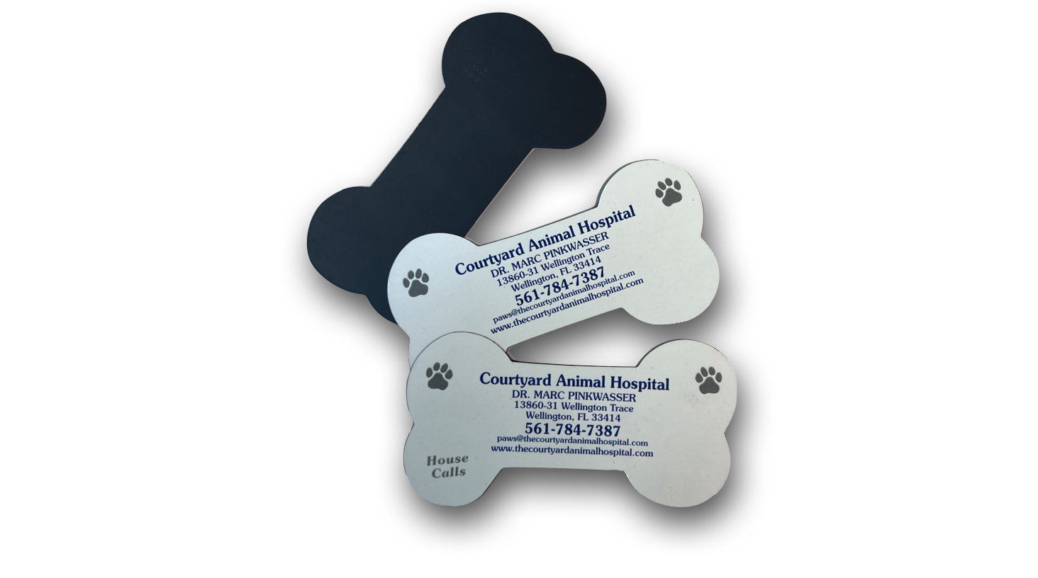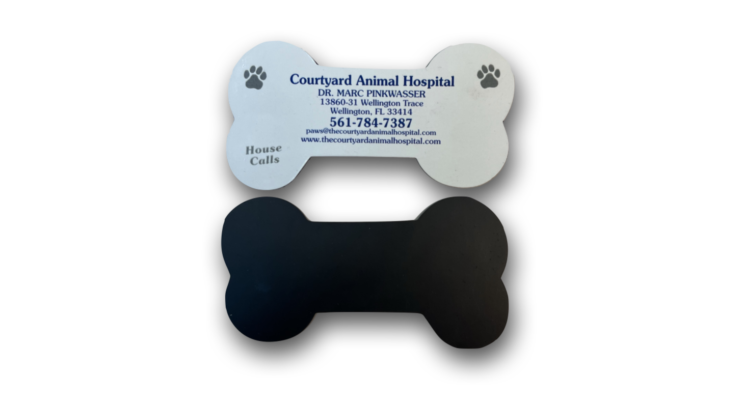 Nothing reminds customers of your animal hospital/veterinary practice more than a bone-shaped magnet does. Imprinted magnets are an exceptional method of keeping your company name/logo & promotional message presented to your market for long periods of time. Please note that our bone magnets are 4.5" x 2.5" –if you would like a custom size/shape, give us a call and we will place an order for your die stamp.