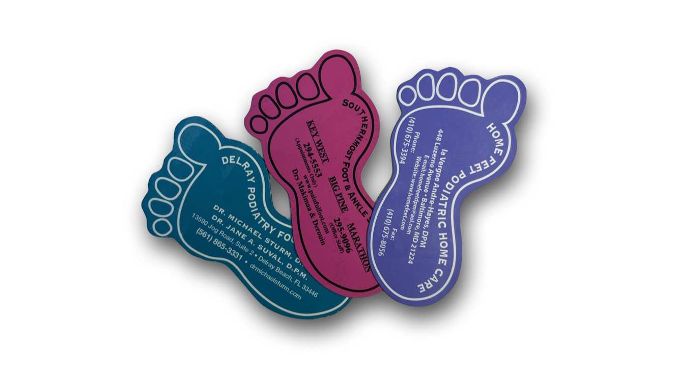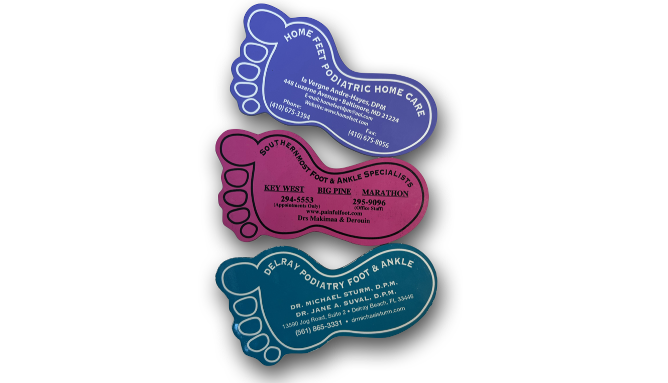 Nothing reminds patients of your podiatry practice more than a foot-shaped magnet does. Imprinted magnets are an exceptional method of keeping your company name/logo & promotional message presented to your market for long periods of time. Please note that our foot magnets are 5" x 2.5"– if you would like a custom size/shape, give us a call and we will place an order for your die stamp.