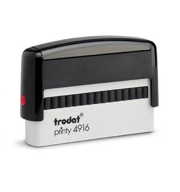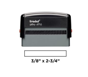 Save time with self-inking stamps and toss your messy and pricy ink pads out. The 4916 Trodat Stamp has a laser engraved rubber die to give a crisp and clean impression. Best for stamping in large quantities, this item can have up to 2 lines of custom text, plus it's re-inkable. With an impression area size of 2.75" x 0.375", a signature and/or typed name are the most common artwork files uploaded for this stamp size, however any text and company logo is also acceptable.