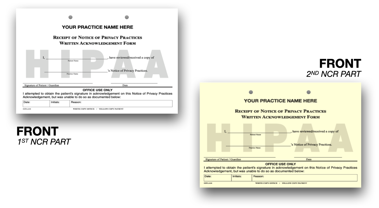 Our HIPAA04 Privacy Notice Acknowledgement Forms come hole-punched for conveniently securing your forms in any file folder of your choosing. These HIPAA forms are also 2 part, providing you with a duplicate copy of your written acknowledgment form every time – perfect for record-keeping and tracking all your privacy notice receipts.