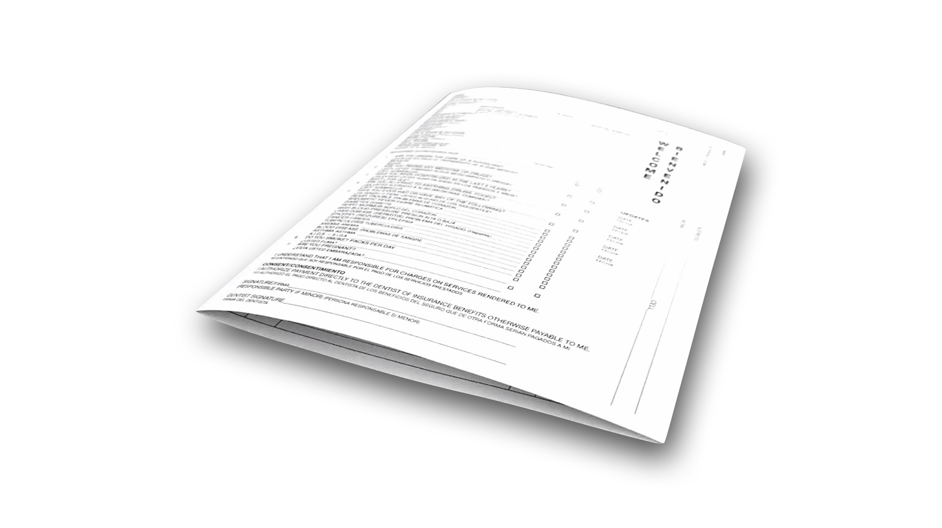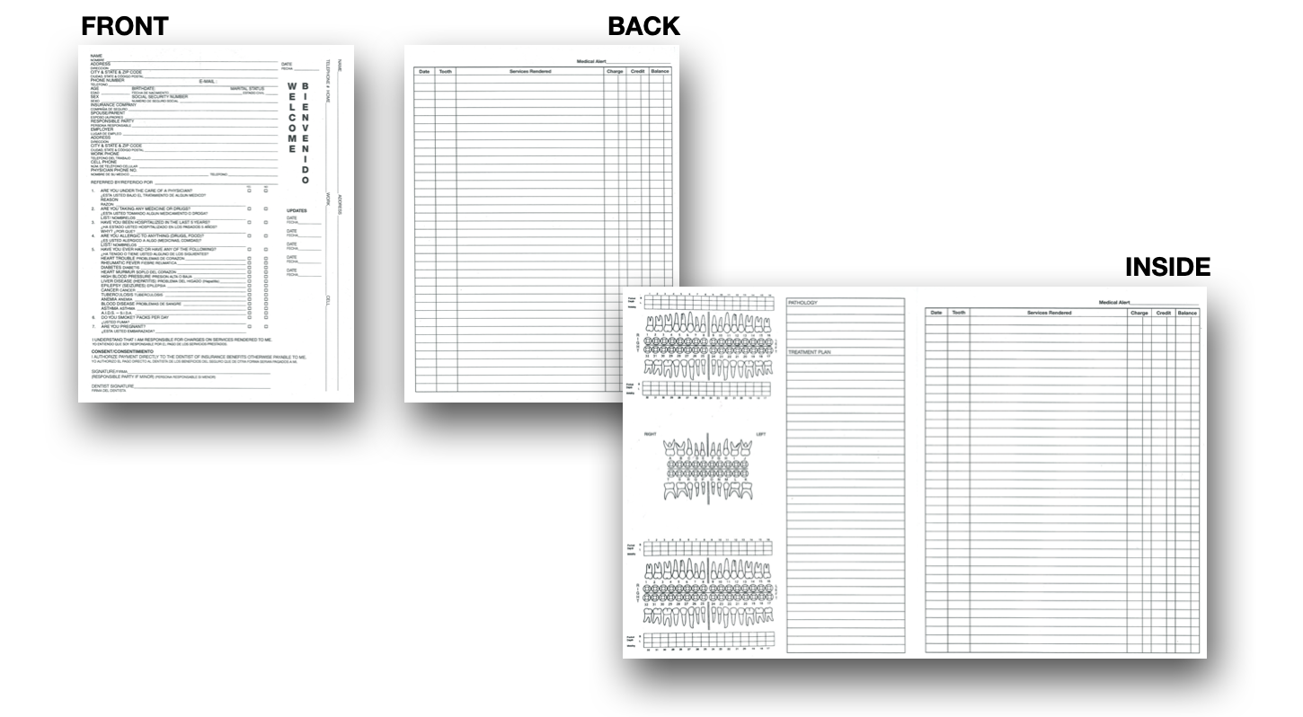 Log your patients and their information with this bilingual dental chart. Each section is written in both English and Spanish for patient comprehension regardless of native tongue.