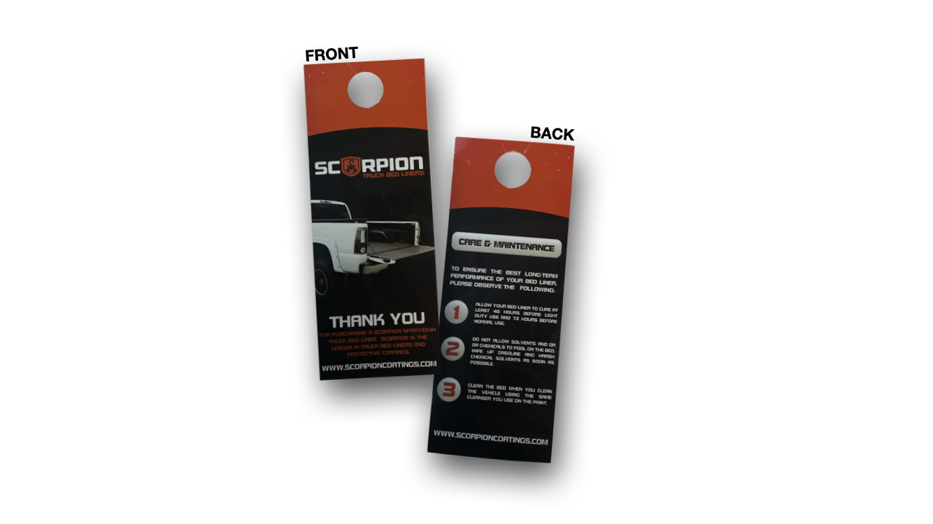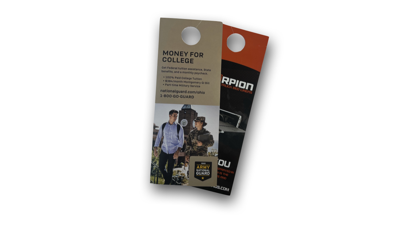 Build your network with this unique and effective marketing resource. Door Hangers allow for increased brand recognition, highly targeted marketing, and extremely visible messages. Choose from our eight stock options to better fit your desired look and feel. Please note that our standard door hanger sizes are 3.5 X 8.5 and 4.25 x 11–make sure that your dimensions are one of these two sizes. If you would like a custom size/shape, give us a call and we will place an order for your die stamp.