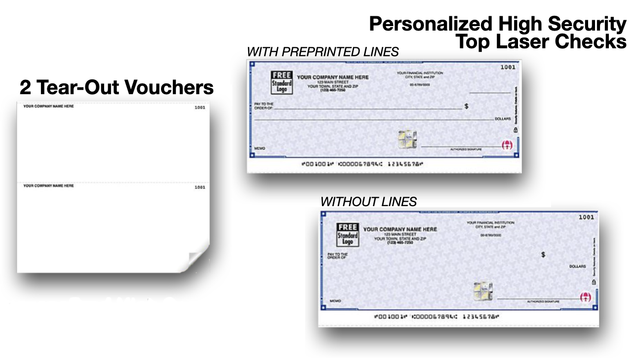 Perfect for companies with a single checking account, our High Security Top Laser Checks conveniently fit any standard laser and inkjet printer, are equipped with two tear-out vouchers for keeping detailed payment records, and a hot-stamped 3D safety hologram seal to protect and defend against check fraud. These lined or unlined laser checks are also compatible with Quicken, QuickBooks, QuickBooks Pro, Microsoft Money, and countless other accounting software.