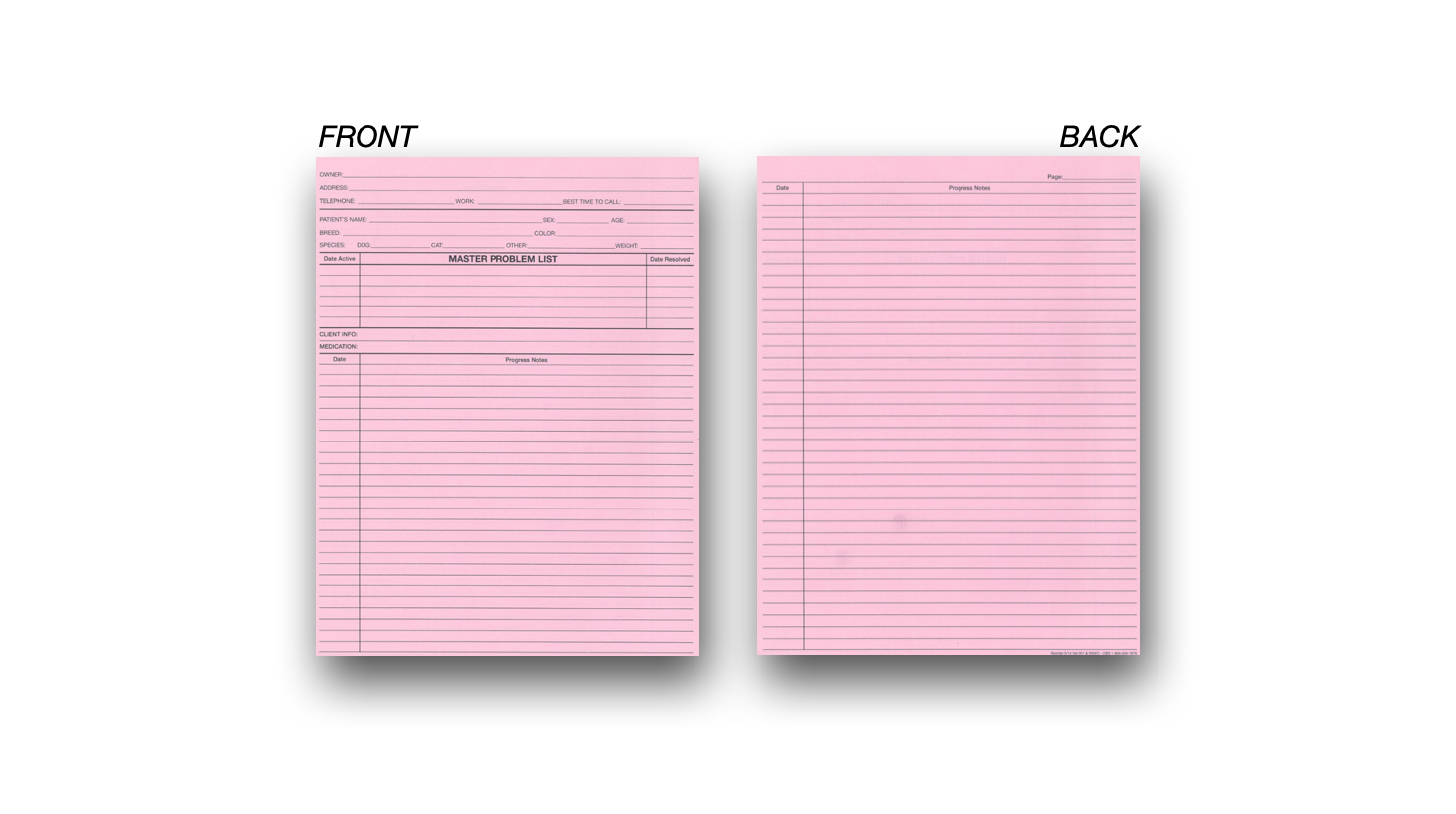 Printing on pink and blue stock is very popular with veterinary practices, with master problem and progress notes being the most common pink & blue forms.If both pink and blue forms are needed in the same order, this product should be added to your cart once with pink stock and once with blue.