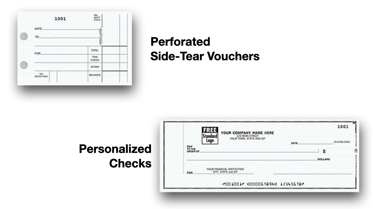 Our Double Signature Checks come hole-punched for conveniently securing your checks in any binder of your choosing and include an end panel to supply you with room for a second signature. These popular 3-to-a-page checks also come equipped with perforated side-tear vouchers that can be detached from your personalized checks – perfect for record-keeping and tracking all your expenses.
