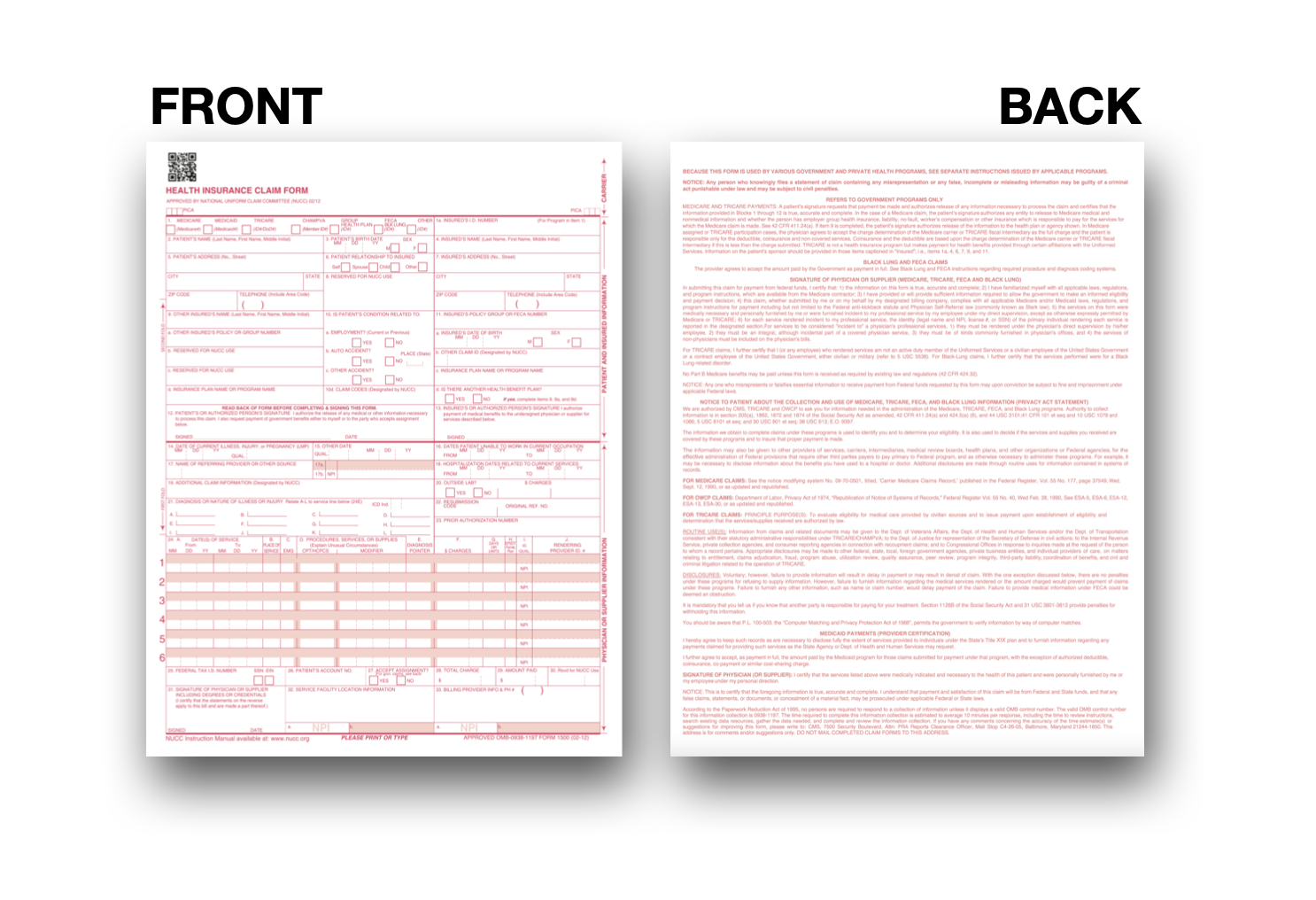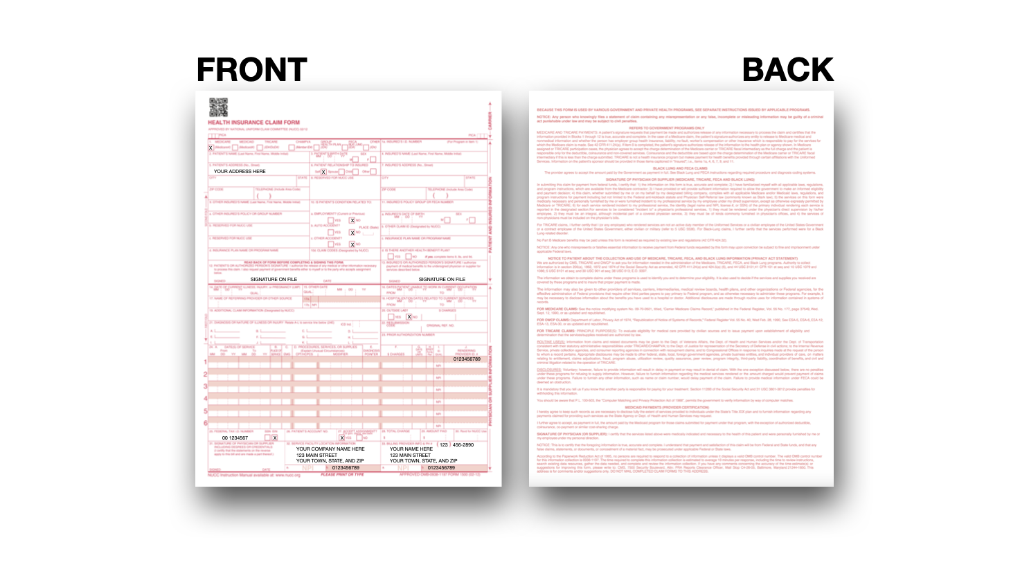If you would like this form personalized, please select 1/0 in the "Personalization" option group and provide an artwork file of your personalized 1500 form (if accessible).